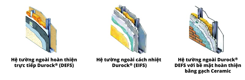 Hệ tường ngoài hoàn hảo luôn Durock (DEFS), Hệ tường ngoài cơ hội nhiệt Durock (EIFS) và Hệ tường bên cạnh Durock DEFS cùng rất mặt phẳng hoàn chỉnh bằng gạch Ceramic.