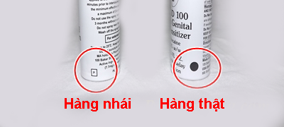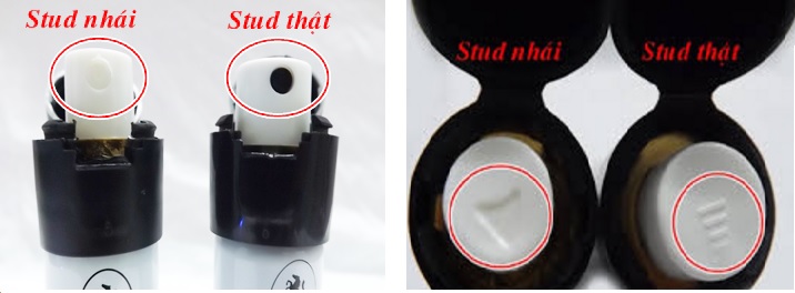 - Phần đầu xịt của Stud 100 thật được thiết kế hình chấm tròn màu đen, còn đầu xịt của Stud 100 giả là màu trắng