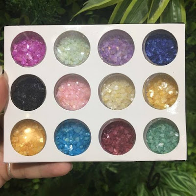 Set Xà Cừ Nail 12 Màu-02 - Xà cừ đá làm từ những miếng đá xà cừ nhỏ, mảnh và được nhuộm với 12 màu sắc đa dạng, đóng gói trong vỉ hộp với 12 lọ kích thước nhỏ - Giá bán: 50.000 vnđ